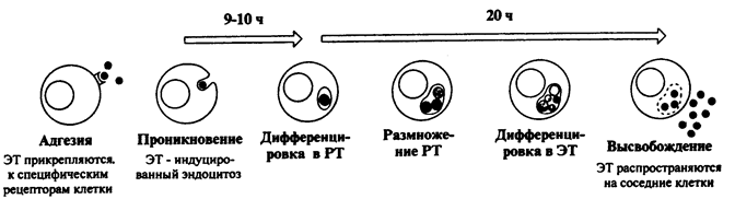 Рис. 24. Принципиальная схема репликативного цикла хламидий. ЭГ - элементарные тельца, РТ – ретикулярные тельца (C.A. Mims et al. Medical Microbiology. Mosby, 1993).