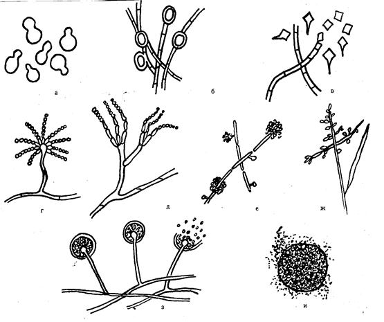 Рис. 26. Неполовое размножение грибов, морфология спор. а – бластоспоры; б – интеркаларные (промежуточные) и терминальные (концевые) хламидиоспоры; в – артроспоры; г – конидии аспергилла; д - конидии пеницилла; е – конидии споротрихума; ж – алейрии; з – спорангии с эндоспорами у мукора; и – сферулы кокцидоидного гриба (Кашкин Н.П., 1979).