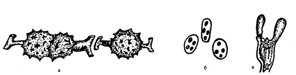Рис. 27. Половые споры грибов. А – зигоспоры; б – аскоспоры; в - базидиоспоры (Кашкин Н.П., 1979).
