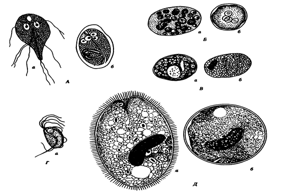 А – лямблия; Б – дизентерийная амеба; В – кишечная амеба; Г – кишечная трихомонада; Д - балантидий кишечный: а – трофозоиты, б – цисты (Ярыгин В.Н., 1997).