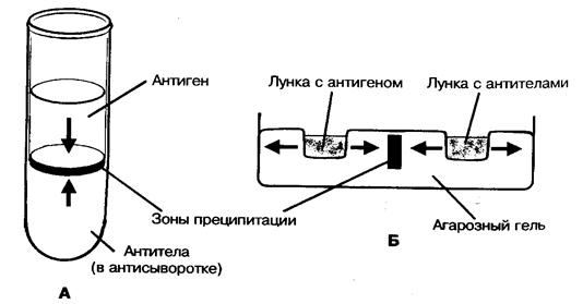 Феномен преципитации заключается во взаимодействии мелкодисперсных антигенов (преципитиногенов) с соответствующими антителами (преципитинами) и образованием преципитата (рис. 42). Постановку РП осуществляют двумя методами: в жидкой среде – по типу реакции флокуляции, кольцепреципитации или в плотной среде в агаре (геле). РП применяют в двух целях: выявление антигенов по известной иммунной преципитирующей сыворотке или антител с использованием известных антигенов. Существует много вариантов постановок реакции, но чаще всего используют следующие методики: реакция преципитации в геле по Оухтерлони, радиальная иммунодиффузия по Манчини, реакция иммуноэлектрофореза, реакция флокуляции, кольцепреципитации.