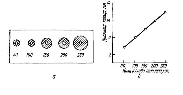 Радиальная иммунодиффузия по Манчини позволяет использовать моноспецифические антисыворотки и эталон с известным содержанием антигена. Тест-антиген и разведения растворов, исследуемых на наличие данного антигена, помещают в лунки, вырезанные рядами в пластине геля, куда предварительно внесена соответствующая моноспецифическая антисыворотка. Антиген диффундирует в гель и, соединившись со специфическими антителами, формирует кольца преципитации, диаметры которых зависят от концентрации антигена в лунках. Полученные результаты используют для построения калибровочной кривой, выражающей зависимость диаметров преципитантов от концентрации антигена в исследуемых растворах (рис. 44).