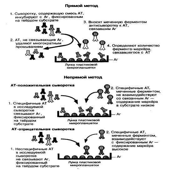 Наиболее распространен твердофазный ИФА, при котором один из компонентов иммунной реакции (антиген или антитело) сорбирован на твердом носителе. В качестве твердого носителя используются микропанели из полистирола. При определении антител в лунки с сорбированным антигеном последовательно добавляют сыворотку крови больных, антиглобулиновую сыворотку, меченную ферментом и смесь растворов субстрата для фермента и хромогена. Каждый раз после добавления очередного компонента из лунок удаляют не связавшиеся реагенты путем тщательного промывания. При положительном результате изменяется цвет раствора хромогена.
