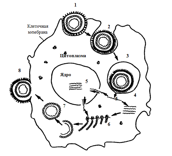 3 – вирус внутри вакуоли клетки; 4 – «раздевание вириона вируса; 5 – репликация вирусной нуклеиновой кислоты; 6 – синтез вирусных белков на рибосомах клетки; 7 – формирование вириона; 8 – выход вириона из клетки путем почкования. (Микробиология и иммунология Под редакцией Воробьева А.А. – М. – 1999).