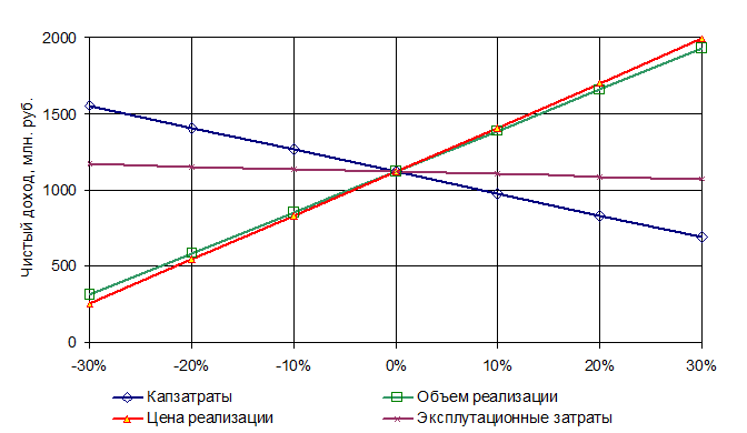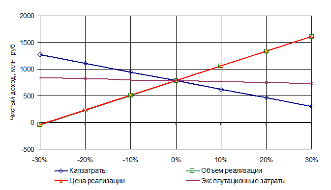 При сложившейся системе рыночных отношений и действующем налогообложении влияние факторов распределяется следующим образом. Наибольшее влияние на основные показатели эффективности проекта оказывает изменение цены реализации нефти (ранг 1); на втором месте при незначительном отличии находится объём реализации продукции (ранг 2); затем следуют капитальные затраты (ранг 3) и наименьшее влияние оказывают эксплуатационные расходы (ранг 4).