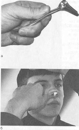 II этап. Передняя риноскопия. Осмотр полости носа проводят при искусственном освещении (налобный рефлектор или автономный источник света), используя носовое зеркало — носорасширитель, который нужно держать в левой руке так, как это показано на рис. 1.3.