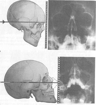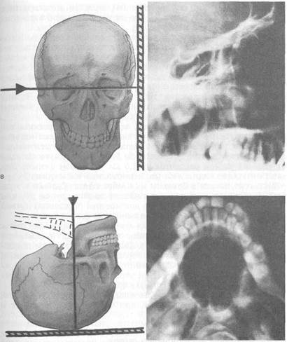При носоподбородочной проекции (затылочно-подбородочная) больной лежит на кассете с открытым ртом, прикасаясь губами и подбородком к кассете. На таком снимке хорошо видны лобные пазухи, а также верхнечелюстные пазухи и ячейки решетчатого лабиринта (рис. 1.4, б).