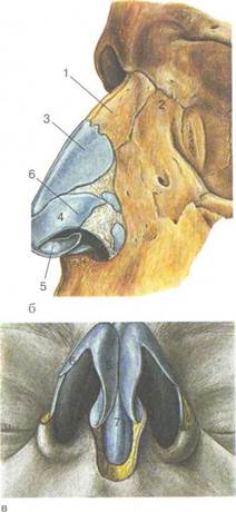 На латеральной стенке (рис. 2.7, а) в виде горизонтальных пластинок располагаются три носовые раковины (conchae nasa-les): нижняя, средняя и верхняя {conchae nasales inferior, media et superior). Нижняя носовая раковина, наиболее крупная по размеру, является самостоятельной костью, средняя и верхняя раковины сформированы решетчатой костью.