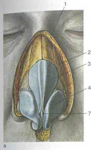 Медиальная стенка, или перегородка носа (septum nasi), состоит из переднего хрящевого и заднего костного отделов (рис. 2.6). Хрящевой отдел образован хрящом перегородки носа — cartilage septi nasi (четырехугольный хрящ), верхний край хряща формирует передний отдел спинки носа, а передненижний