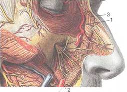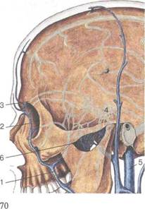 Венозные сосуды. Особенностью венозного оттока из полости носа является его связь с венами крыловидного сплетения {plexus pterygoideus) и далее пещеристого синуса {sinus cavernosus), располагающегося в средней черепной ямке. Это создает возможность распространения инфекции по указанным путям и возникновения риногенных и орбитальных внутричерепных осложнений.