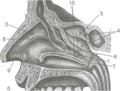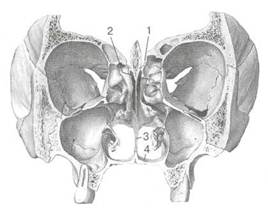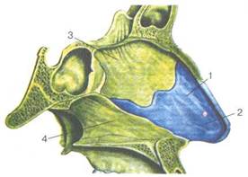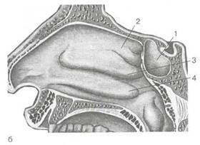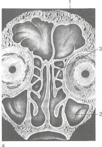 а — фронтальная проекция: 1 — лобная, 2 — верхнечелюстная, 3 — ячейки решетчатого лабиринта; б — вид сбоку: 1 — клиновидная пазуха, 2 — верхняя носовая раковина, 3 — средняя носовая раковина, 4 — нижняя носовая раковина.