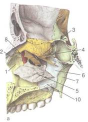 Задняя стенка пазухи толстая, соответствует бугру верхней челюсти {tuber maxillae) и своей задней поверхностью обращена в крылонебную ямку, где расположены верхнечелюстной нерв, крылонебный узел, верхнечелюстная артерия, крыловидное венозное сплетение.