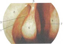 Рис 2.8. Остиомеатальный комплекс (картина при эндоскопии). I _- крючковидный отросток- 2 — ячейки валика носа- 3 — большой решетчатый пузырек; 4 - перегородка носа; 5 - основание средней носовой раковины; 6 — передний конец средней носовой ракови-н^[; 7 — общий носовой ход.
