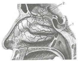 Рнс. 2.11. Кровоснабжение полости носа. 1 _ клиновидно-небная артерия; 2 — решетчатые артерии.