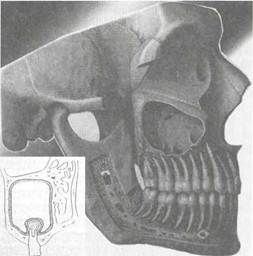 Нижней стенкой, или дном, пазухи является альвеолярный отросток верхней челюсти. Дно верхенечелюстной пазухи при средних ее размерах лежит примерно на уровне дна полости носа, но нередко располагается и ниже последнего. При уве-