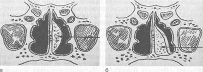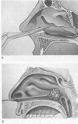 Рис. 2.20. Операции при хроническом гипертрофическом рините, а — щадящая нижняя конхотомия; б — удаление заднего конца при гипертрофии нижней носовой раковины полипной петлей.