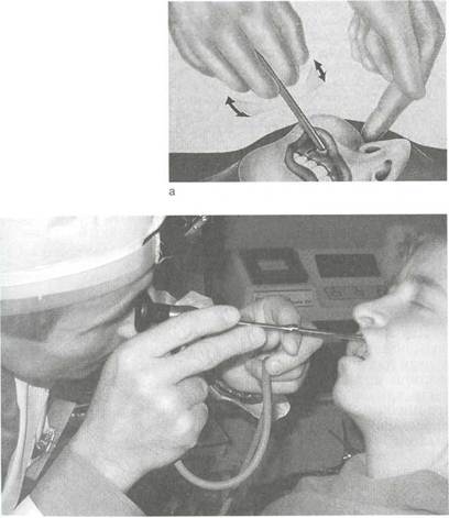 | рис. 2.41.Эндоскопическая синусоскопия. а _ схема введения троакара; б — проведение исследования. |