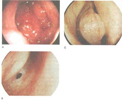 | Рис. 2.40.Эндоскопическое исследование полости носа, а — задний конец нижней носовой раковины, свод носоглотки с аденоидными вегетациями; б — передний конец средней носовой раковины, большой решетчатый пузырек, крюч-ковидный отросток; в — отверстие клиновидной пазухи. |