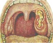 При фарингоскопии — отек и гиперемия боковой стенки глотки с распространением на мягкое небо, язычок; небная миндалина на стороне поражения выпирает кнаружи.