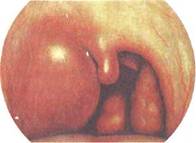 Фарингоскопическая картина зависит от локализации инфильтрата. При передневерхней локализации отмечается резкое шаровидное выбухание в области верхнего полюса миндалины, которая вместе с небными дужками и мягким небом оказывается смещена к средней линии, язычок при этом смещен в противоположную сторону. При задней локализации отмечается выраженная припухлость в области небно-глоточ-ной дужки и боковой стенке глотки. Небная миндалина и язычок отечны, инфильтрированы и смещены кпереди. При нижней локализации паратонзиллита отек может распространяться на верхний отдел гортани, вызывая ее стенозирование. Эта форма паратонзиллита имеет менее выраженные фарингоскопические признаки. Отмечаются отек и инфильтрация нижних отделов дужек, нижнего полюса миндалины и прилежащей части корня языка.