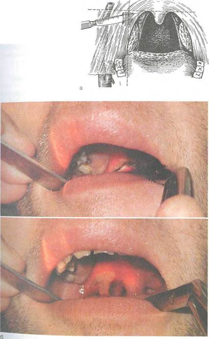 | Рис 3.17. Вскрытие паратонзиллярного абсцесса. а _ схема разреза; б - эвакуация гнойного содержимого. |