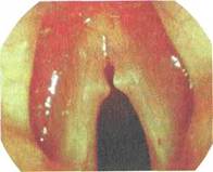 При диффузной форме гиперпластического процесса слизистая оболочка утолщена, пастозна, гиперемирована; края голосовых складок утолщены и деформированы на всем протяжении, что препятствует их полному смыканию.
