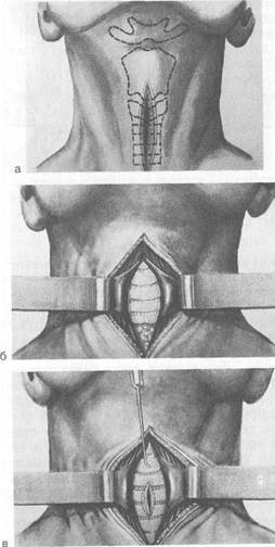 Иногда при быстро развивающейся асфиксии производят операцию в полусидячем или сидячем положении. Обезболивание местное — 1 % раствор новокаина с примесью 0,1 % раствора адреналина (1 капля на 5 мл). Прощупывают подъязычную кость, нижнюю вырезку щитовидного и дугу перстневидного хряща. Для ориентировки можно бриллиантовым зеленым от-