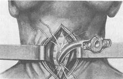 метить срединную линию и уровень перстневидного хряща. Производят послойный разрез кожи и подкожной клетчатки от нижнего края щитовидного хряща на 4—6 см, вертикально книзу строго по срединной линии. Рассекают поверхностную пластинку шейной фасции, под которой обнаруживается белая линия — место соединения грудино-подъязычных мышц. Последнюю надсекают и тупым путем нежно отсепаровывают мышцы. После этого обозревается часть перстневидного хряща и перешеек щитовидной железы, который имеет темно-красный цвет и на ощупь мягкая. Затем производят разрез капсулы железы, фиксирующей перешеек, последний смещают книзу и удерживают тупым крючком. После этого становятся видными кольца трахеи, покрытые фасцией. Для вскрытия трахеи необходим тщательный гемостаз. Для фиксации гортани, экскурсии которой при асфиксии значительно выражены, вкалывают острый крючок в щитоподъязычную мембрану. Во избежание сильного кашля в трахею вводят несколько капель 2—3 % раствора дикаина. Остроконечным скальпелем вскрывают 2—3 кольца трахеи. Скальпель необходимо вонзать не слишком глубоко, чтобы не поранить заднюю, лишенную хряща стенку трахеи и прилегающую к ней переднюю стенку пищевода. Величина разреза должна соответствовать величине трахеотомической трубки. Для формирования трахеостомы кожу в окружности раны на шее отсепаровывают от подлежащих тканей и четырьмя шелковыми нитями подшивают к надхрящнице рассеченных колец трахеи. Края трахеостомы раздвигают при помощи расширителя Труссо и вводят трахеотомическую трубку. Последнюю фиксируют с помощью марлевой повязки на шее.