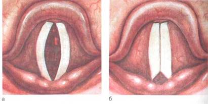 а — двусторонний паралич голосовой мышцы; б — паралич поперечной черпаловидной мышцы.