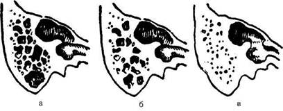 | Рис. 5.8. Типы сосцевидного отростка. а — пневматический; б — диплоический; в — склеротический. |