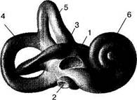 Рис. 5.9. Костный лабиринт. 1 — окно преддверия; 2 — окно улитки; 3 — ампула латерального полукружного канала; 4 — передний полукружный канал; 5 — задний полукружный канал; 6 — улитка.