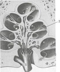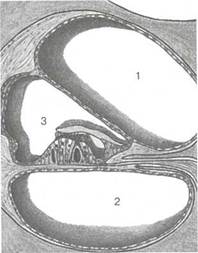 Рис. 5.12. Расположение улиткового протока в базальном завитке улитки. 1 — лестница преддверия; 2 — барабанная лестница; 3 — улитковый проток.