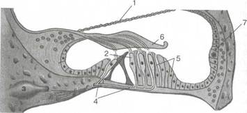 1 — преддверная (рейсснерова) мембрана; 2 — волосковые клетки; 3 — спиральный узел; 4 — нервные волокна к волосковым клеткам; 5 — опорные клетки; 6 — покровная мембрана; 7 — сосудистая полоска.