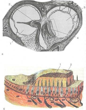 а — ампулярный рецептор: 1 — просвет ампулы полукружного протока, 2 — ампулярный гребешок, 3 — просвет эллиптического мешочка, 4 — мембрана статоконий; б — статокониев рецептор: 1 — мембрана статоконий, 2 — рецеп-торные клетки.
