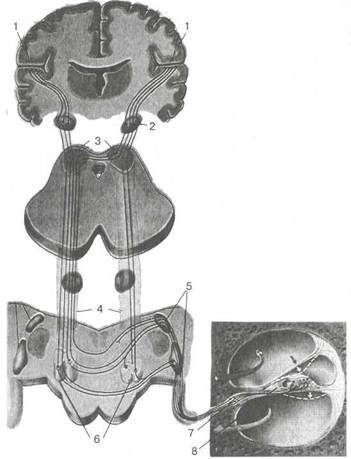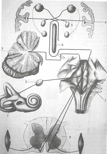Рис. 5.17. Схема ассоциативных связей вестибулярного анализатора. 1 — лабиринт; 2 — преддверный узел; 3 — мозжечок; 4 — кора полушарий большого мозга; 5 — ядра глазодвигательных нервов; б — ретикулярная формация; 7 — вестибулярные ядра в продолговатом мозге; 8 — спинной мозг.