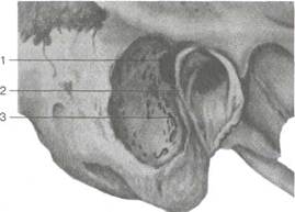 1 — сосцевидная пещера; 2 — задняя стенка наружного слухового прохода; 3 — вскрытые сосцевидные ячейки.