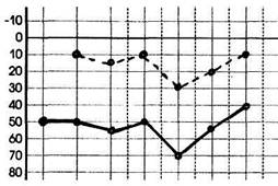 При тимпанальной форме наблюдается кондуктивная тугоухость, характеризующаяся повышением порогов воздушного проведения на тональной пороговой аудиограмме от 40 дБ — I степень тугоухости — до 65—70 дБ — III степень (рис. 5.46). Пороги костного проведения находятся в пределах нормы (до 20 дБ на речевых частотах), костно-воздушный интервал составляет 30—45 дБ. Это так называемый резерв улитки, на который возможно улучшить слух во время хирургического вмешательства. При этом можно ожидать значительного улучшения и даже полного восстановления слуха у больного, так как нет поражения звуковоспринимающего аппарата. Эта форма заболевания является наиболее благоприятной с точки зрения эффективности хирургического лечения.