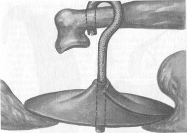 стремени, нередко возникает пролежень в месте давления протеза на вену, что ведет к глубокому поражению функции рецепторов. Учитывая это, В.Т. Пальчун (1969) предложил другой метод закрытия окна преддверия — после укрепления протеза на длинной ножке наковальни и введения второго его конца в окно преддверия (стремя удалено) полоску вены укладывают в виде шарфа вокруг протеза, закрывая просвет между ним и краем окна (рис. 5.48). В настоящее время для изготовления протеза наряду с различными синтетическими материалами все чаще используют аутохрящ, аутокость. Учитывая, что вмешательство на окне преддверия как в ближайшем, так и в отдаленном периоде таит серьезные опасности для функции внутреннего уха, хирургическое вмешательство обычно осуществляется на хужеслышащем ухе. Операцию на другом ухе проводят не ранее 6 мес при хорошем функциональном эффекте первой операции.