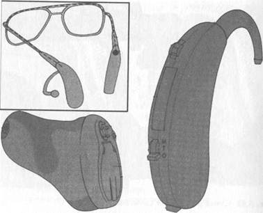 карманные и внутриушные (рис. 5.49). Современные миниатюрные слуховые аппараты выполнены в виде ушного вкладыша. Внутриушные аппараты обеспечивают акустическое усиление в 20—30 дБ, заушные — 40—75 дБ, карманные — 50—80 дБ.