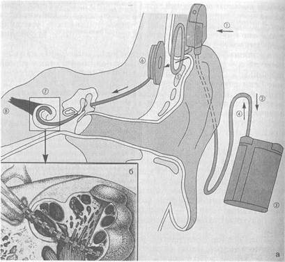 В последние десятилетия разрабатывается и внедряется в практику новый метод слуховой реабилитации больных с тяжелой степенью тугоухости и глухотой периферического типа — кохлеарная имплантация. Это хирургический метод протезирования улитки с целью восстановления утраченной функции восприятия и переработки звуковой информации периферическим отделом слухового анализатора. Звуковой сигнал перерабатывается в электрические импульсы с последующей стимуляцией улитковой части преддверно-улиткового нерва через электроды, введенные в барабанную лестницу улитки (рис. 5.50). Воспринимаемый микрофоном (1) звук передается по кабелю (2) к голосовому процессору (3). Здесь голосовой сигнал смешивается с имеющейся в памяти информацией о пациенте и преобразуется для формирования радиосигнала, который по кабелю (4) передается к радиопередатчику (5). Сигнал посылается в виде радиоволн на датчик имплантата (6). Информация воспринимается и приводит к раздражению пары электродов (7). Тем самым электрически активизируется нерв (8) и пациент получает звуковое раздражение.