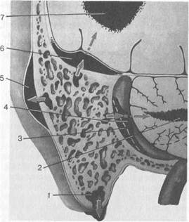Рис. 5.51. Пути распространения инфекции из полостей среднего уха контактным путем. 1 — прорыв гноя под мышцы шеи через верхушку сосцевидного отростка; 2 — абсцесс мозжечка; 3 — периси-нуозный абсцесс; 4 — синустромбоз; 5 — суб-периостальный абсцесс; б — экстраду-ральный абсцесс; 7 — абсцесс височной доли большого мозга.