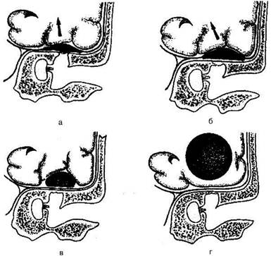 Различают экстрадуральный, субдуралъный, а также внутри-мозговые абсцессы (рис. 5.52). Их расположение по отношению к оболочкам мозга и самому веществу мозга в определенной степени отражает этапы распространения инфекции из полостей среднего уха.