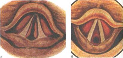 а — инфильтративный процесс; б — рубцовая диафрагма гортани, суживающая ее просвет.