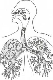 В трахее инфильтраты, а затем рубцовая ткань могут располагаться в различных отделах, но чаще определяются в области бифуркации (рис. 6.7). Рубцы выявляются в одном, а чаще в обоих бронхах, и просвет их прогрессивно уменьшается. Одним из основных симптомов при этом является кашель с трудно отхаркиваемой мокротой, затем возникает затруднение дыхания. Реакция связывания комплемента со склеромным антигеном при рубцовой форме может быть отрицательная, особенно после лечения специфическими препаратами; палочка склеромы может и не высеваться.
