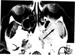 Рис. 7.4. Компьютерная томограмма черепа больного с юношеской ангиофибромой (указана стрелкой). Прорастание опухоли в глазницу, верхнечелюстную пазуху и решетчатые ячейки.
