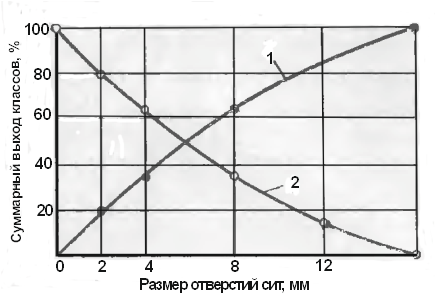 Характеристикой крупности называют графическое изображение гранулометрического состава сыпучего материала. Характеристики крупности строят в прямоугольной системе координат. Суммарную характеристику крупности Y = f(x) строят по точкам, положение которых находят по абсциссам х – диаметрам кусков и ординатам Y – суммарным выходам классов мельче или крупнее x.