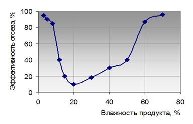 12 Как зависит эффективность грохочения от влажности продукта питания грохота