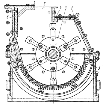 Основными частями молотковой дробилки (рисунок …) являются: корпус 1 с загрузочным отверстием 2; расположенный горизонтально вращающийся ротор 3 (один или два) с шарнирно закрепленными молотками 4, колосниковая решетка 5 и отбойные плиты (или стержни) 6.