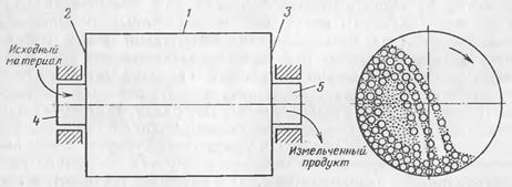 Барабанная мельница (рисунок …) представляет собой пустотелый барабан 1, закрытый торцовыми крышками 2 и 3, в центре которых имеются полые цапфы 4 и 5. Цапфы опираются на подшипники, и барабан вращается вокруг горизонтальной оси. Барабан заполняется примерно на половину объема дробящими телами (стержнями). При его вращении дробящие тела благодаря трению увлекаются его внутренней поверхностью, поднимаются на некоторую высоту и свободно или перекатываясь падают вниз. Через одну полую цапфу внутрь барабана непрерывно подается измельчаемый материал, который проходит вдоль него и, подвергаясь воздействию дробящих тел, измельчается ударом, истиранием и раздавливанием. Измельченный продукт непрерывно разгружается через другую полую цапфу. При вращении барабана материал движется вдоль его оси вследствие перепада уровней загрузки и_разгрузки и напора непрерывной подачи материала; если измельчение мокрое, то материал увлекается сливным потоком воды.