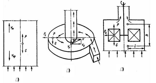 В процессе воздушной классификации в сепараторах различают три схемы разделения частиц материала (рисунок …): вертикально-проточную, прямоточно-центробежную, центробежную поперечно-проточную.